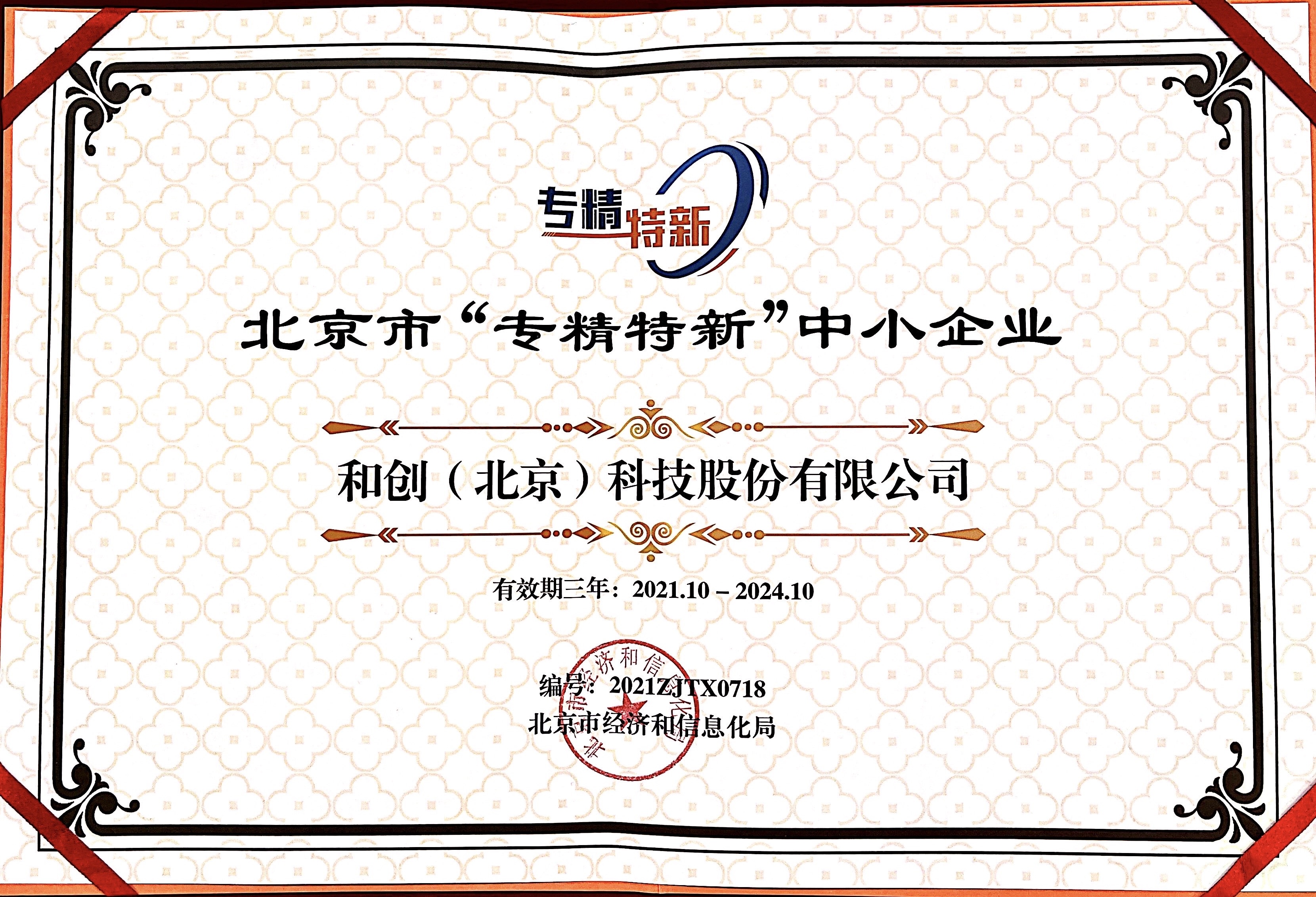 2021 年 10 月 29 日,北京市經(jīng)濟(jì)和信息化局將北京市 2021 年度第六批擬認(rèn)定“專精特新”中小企業(yè)名單予以公示,和創(chuàng)(北京)科技股份有限公司榮登榜單,此次公示期為 10 月 29 日至 11 月 4 日,目前已通過公示期。 根據(jù)北京市經(jīng)濟(jì)和信息化局的評審程序的有關(guān)規(guī)定,對于公示期無異議的,認(rèn)定為“北京市‘專精特新’中小企業(yè)”。