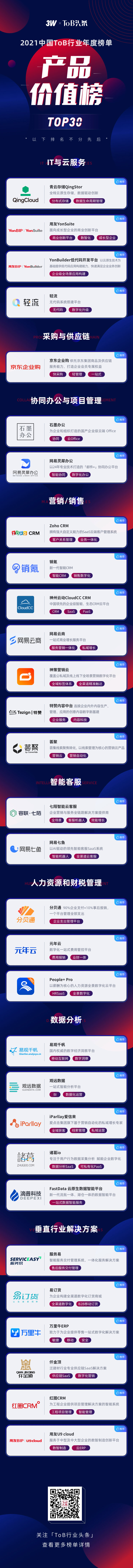 此次評選共歷時2個月,由「ToB行業頭條」聯手3W集團、50+投資機構及行業專家,從產品質量、技術應用、研發投入、用戶規模和產品復購率等多個維度對參評產品進行綜合評判,最終從報名及推薦參選的100多家產品中挑選出了最具市場價值的ToB產品TOP30。