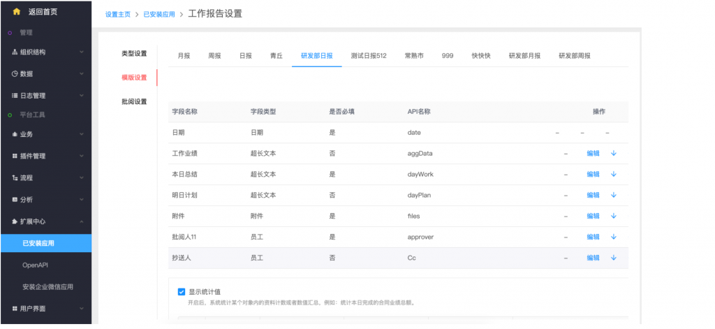 - 后臺設置:系統設置——擴展中心——已安裝應用——工作報告,類型設置支持新建類型;在模板設置中,可以按業務類型設置不同的字段和統計值;統計值設置,支持自定義名稱;