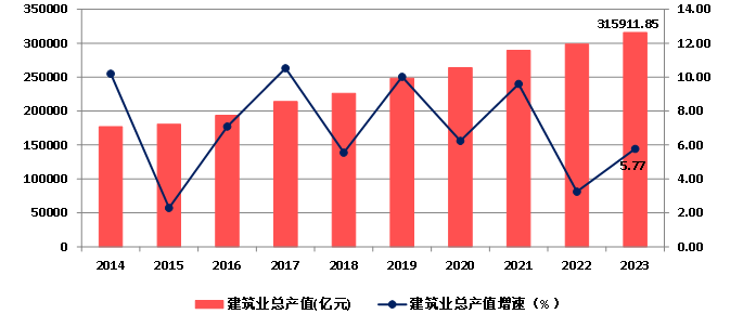 2014年以來,隨著我國建筑業(yè)企業(yè)生產(chǎn)和經(jīng)營規(guī)模的不斷擴大,建筑業(yè)總產(chǎn)值持續(xù)增長,2023年達到315911.85億元,比上年增長5.77%。增速較上年提高2.52個百分點(圖3)。