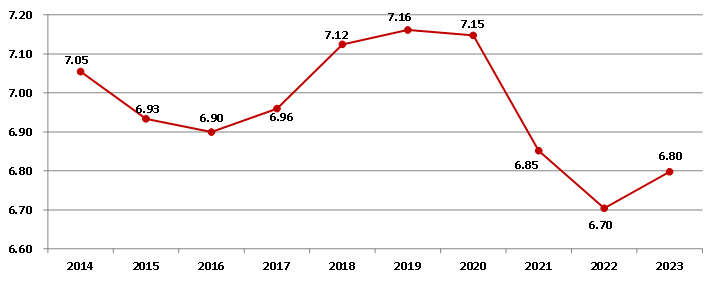自2014年以來,建筑業(yè)增加值占國內(nèi)生產(chǎn)總值的比例始終保持在6.70%以上,2023年為6.80%(圖2),建筑業(yè)國民經(jīng)濟支柱產(chǎn)業(yè)的地位穩(wěn)固。