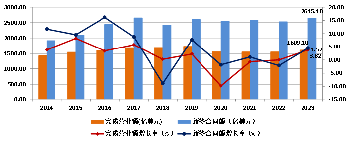 2023年,我國對外承包工程業(yè)務完成營業(yè)額1609.1億美元,比上年增長3.83%,新簽合同額2645.1億美元,比上年增長4.52%(圖14)。
