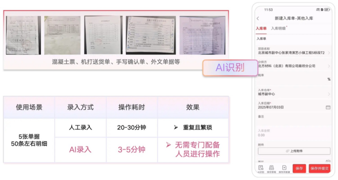紅圈AI系列智能產品在成本控制的精度與效率上實現了進一步飛躍。AI錄單助手能夠通過大模型自動識別合同、結算單、出入庫單等各類單據,智能提取關鍵字段并自動回填業務系統,可減少90%的人工操作,將成本控制效率提升2.5倍。同時,AI報表助手能對《成本多算對比分析表》等進行秒級解析,快速識別成千上萬條成本清單的潛在風險與異常,輔助項目經理和成本經理進行更深入、更全面的成本分析,拓展其分析視野,從而更及時地進行成本干預。