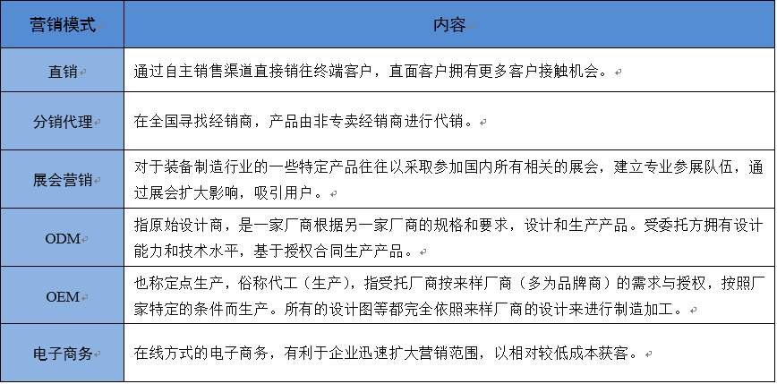 裝備制造業(yè)中由于子行業(yè)眾多,不同子行業(yè)經(jīng)營(yíng)銷售模式不完全相同,營(yíng)銷側(cè)重點(diǎn)也有所不同。如汽車制造中的汽車整車營(yíng)銷模式側(cè)重于經(jīng)銷、專賣等模式,而諸如大型通用設(shè)備、電氣設(shè)備則側(cè)重于展會(huì)營(yíng)銷、招投標(biāo)等模式;在電子設(shè)備中OEM、ODM模式則較為普遍。